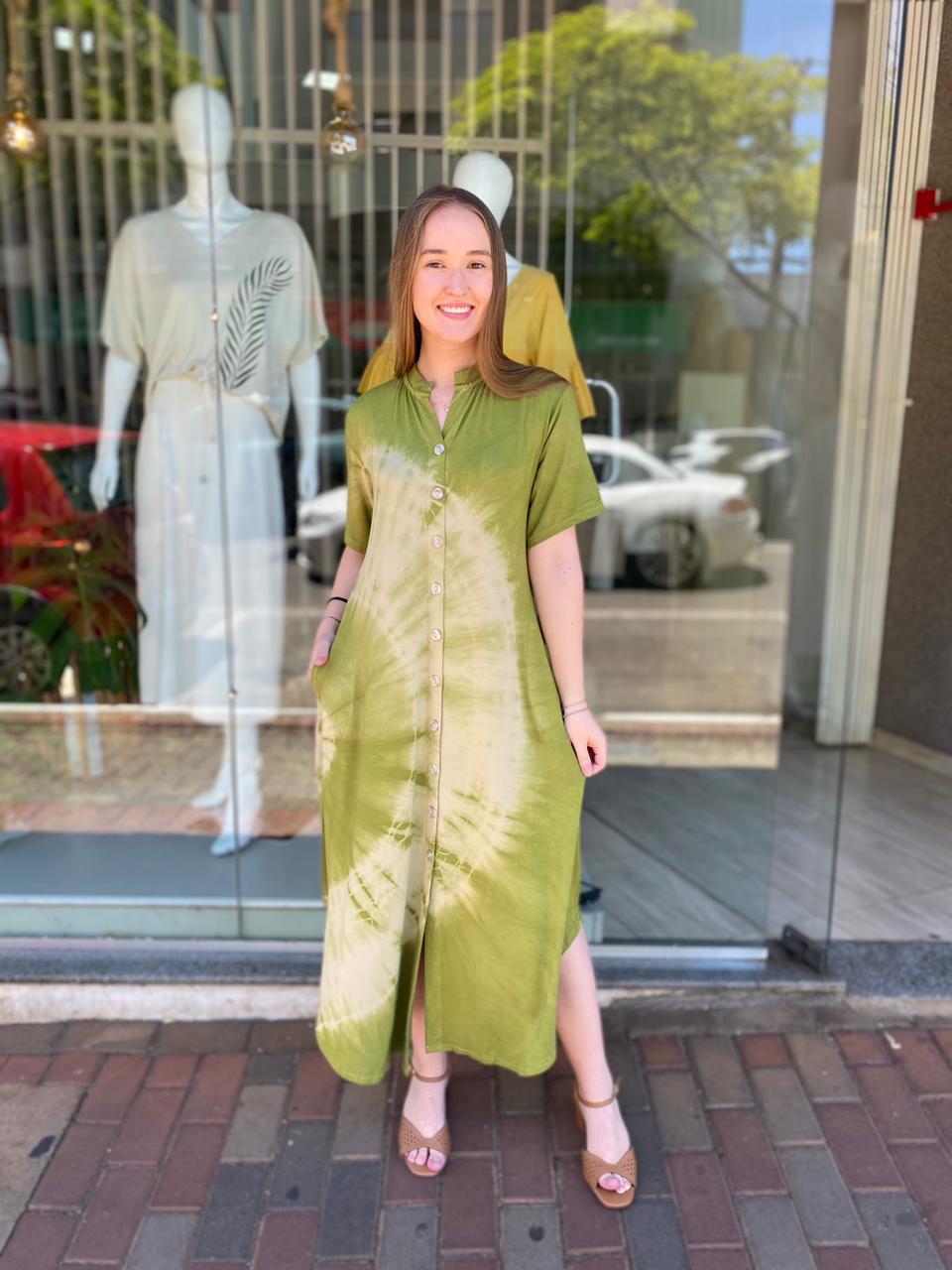Chemise longa em tecido leve, com tingimento artesanal e botões frontais. Possui modelagem soltinha, caimento confortável e bolsos laterais, trazendo praticidade e estilo no mesmo look. Ideal para usar sozinha ou aberta como terceira peça.