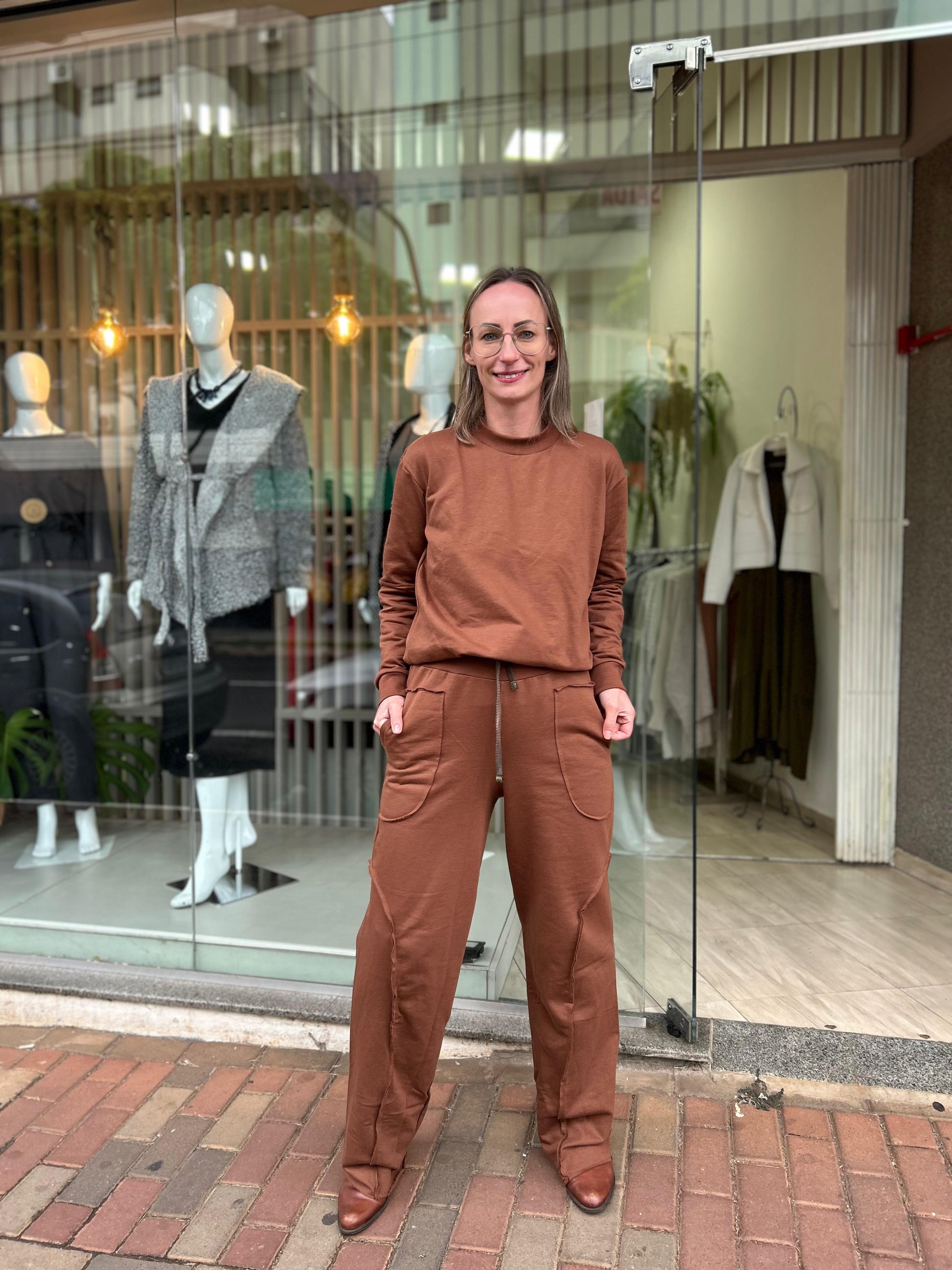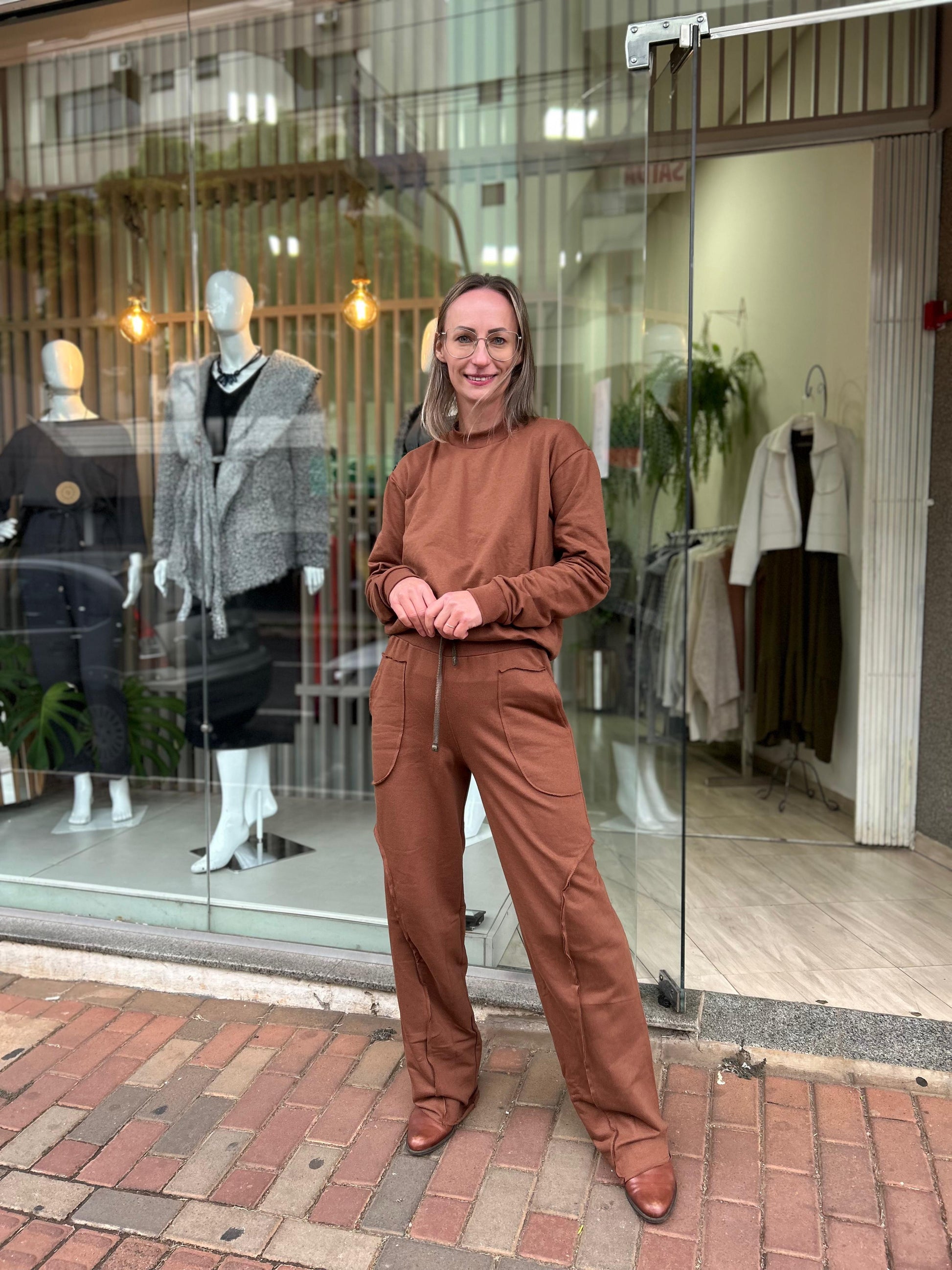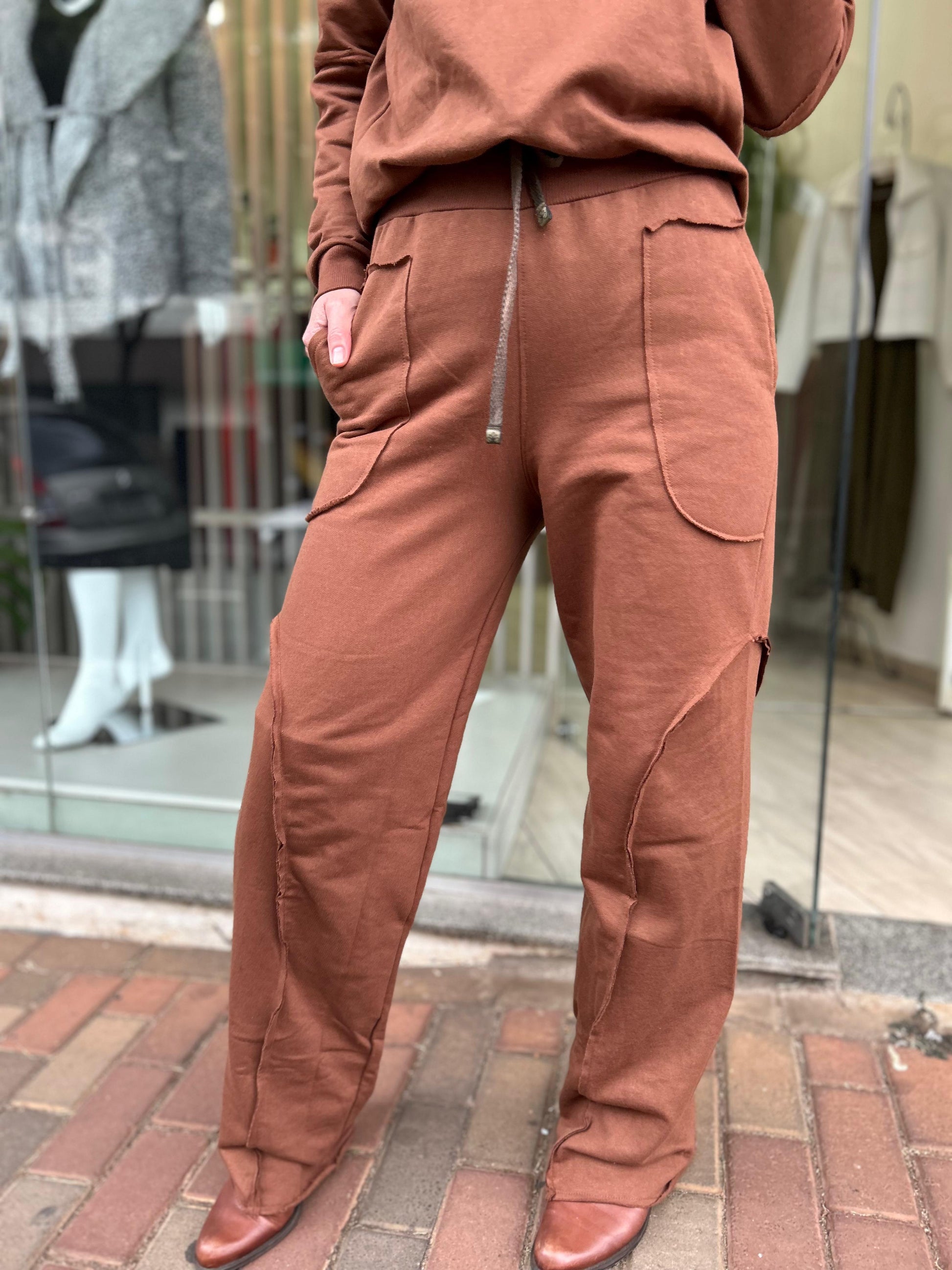 Conjunto no tecido 100% algodão, forrado e peluciado por dentro, com tingimento artesanal que torna a peça única. Veste uma modelagem ampla do P ao G. Contém regulagem na cintura, bolsos e um corte que valoriza seu corpo sem marcar nada.