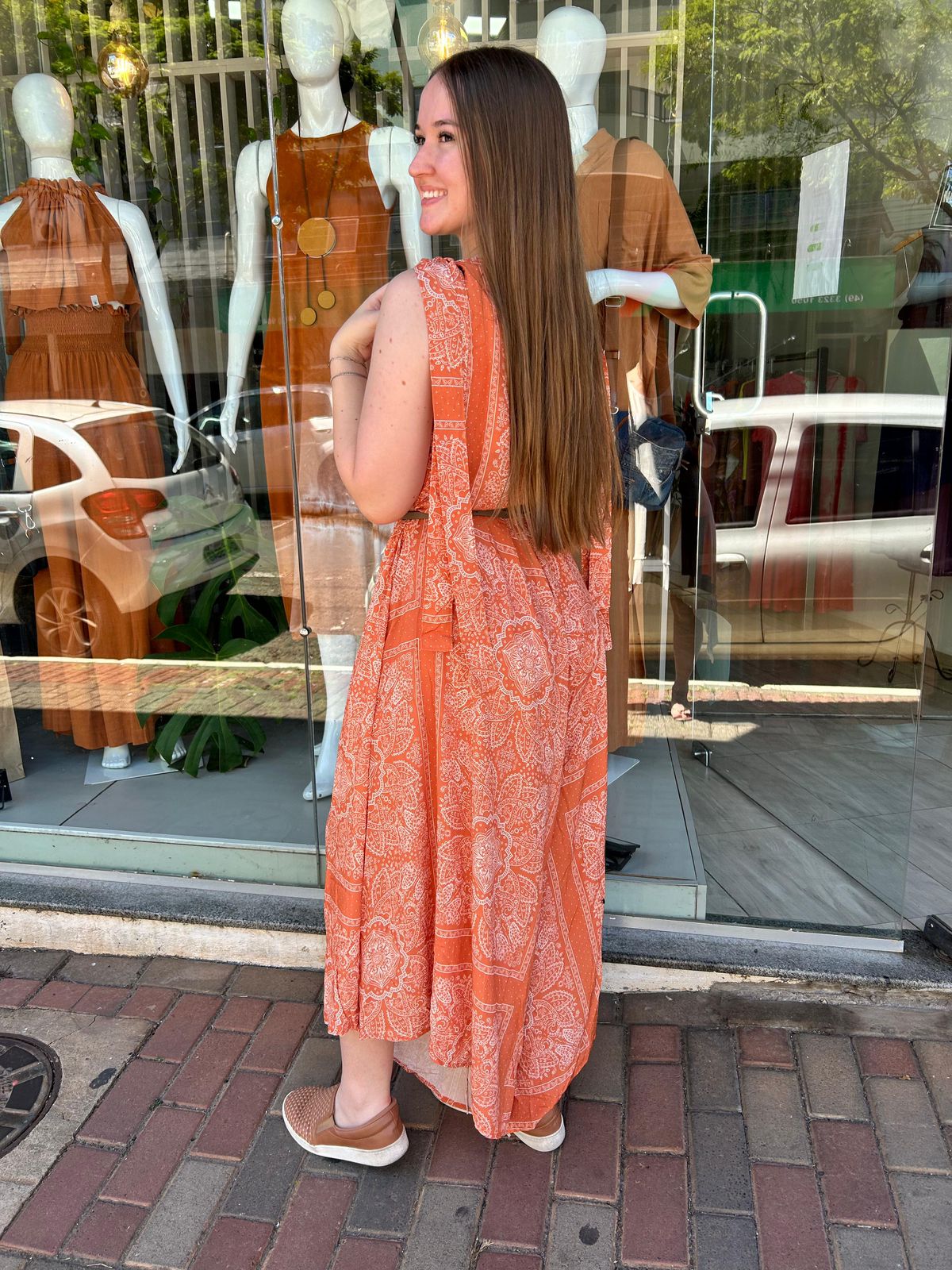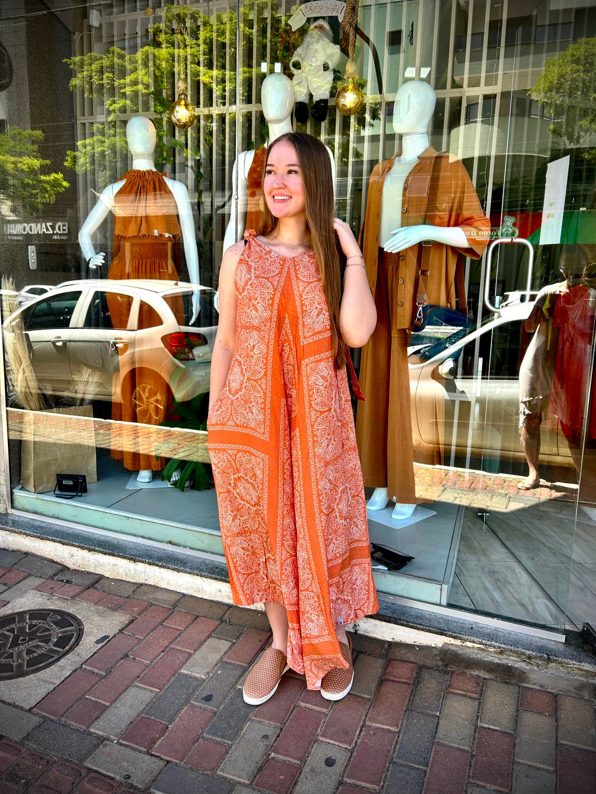 Esse macacão longo com estampa em tons de laranja e detalhes paisley exala um estilo boho chic, perfeito para dias ensolarados ou ocasiões casuais. Seu corte amplo e fluido proporciona um caimento leve e confortável, ideal para quem busca elegância sem abrir mão do bem-estar. O detalhe da amarração nos ombros adiciona um charme especial, permitindo um ajuste personalizado.