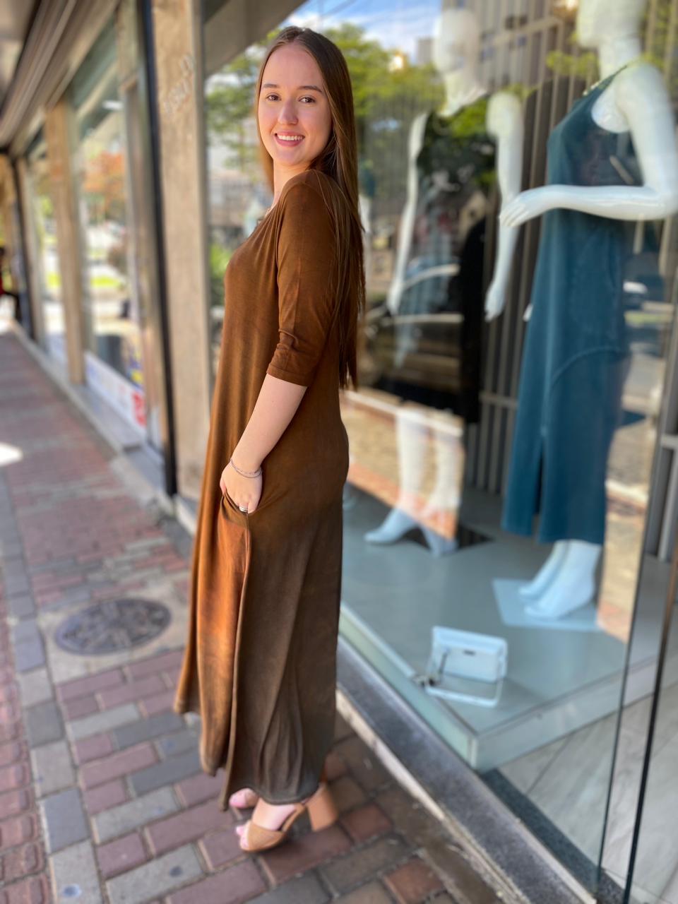O decote arredondado traz um visual clássico e atemporal, enquanto as mangas 3/4 deixam a peça prática para diferentes estações. A saia com caimento fluido proporciona movimento e elegância, tornando o vestido perfeito tanto para o dia a dia quanto para produções mais arrumadas com acessórios certos.